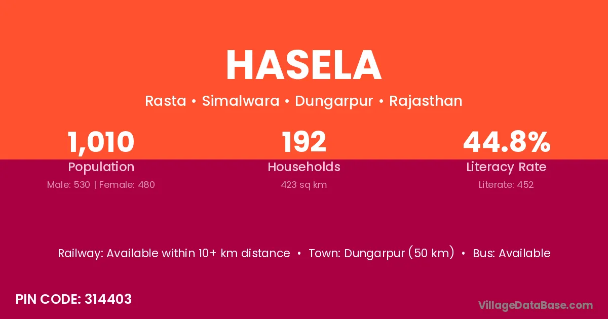 Dungarpur (50 km) is the nearest town to Hasela village for major economic activities and is located approximately 50 km away.
