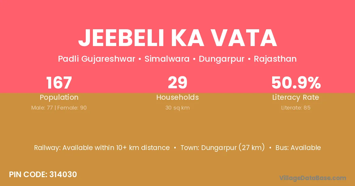 Dungarpur (27 km) is the nearest town to Jeebeli Ka Vata village for major economic activities and is located approximately 27 km away.