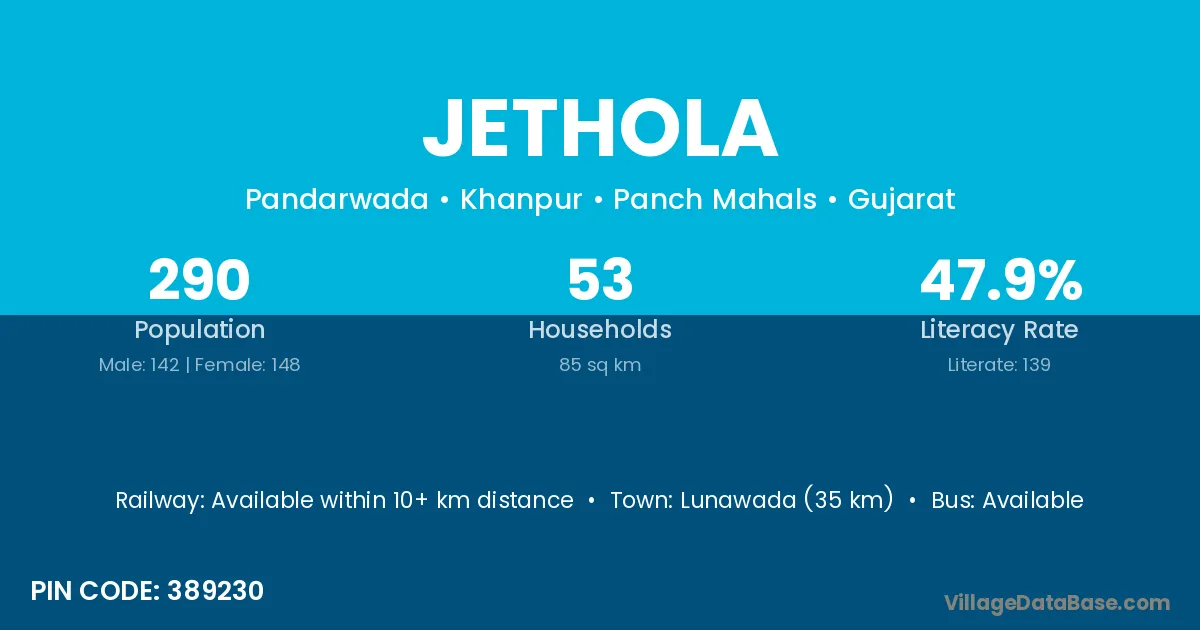 Dungarpur (53 km) is the nearest town to Jethola village for major economic activities and is located approximately 53 km away.