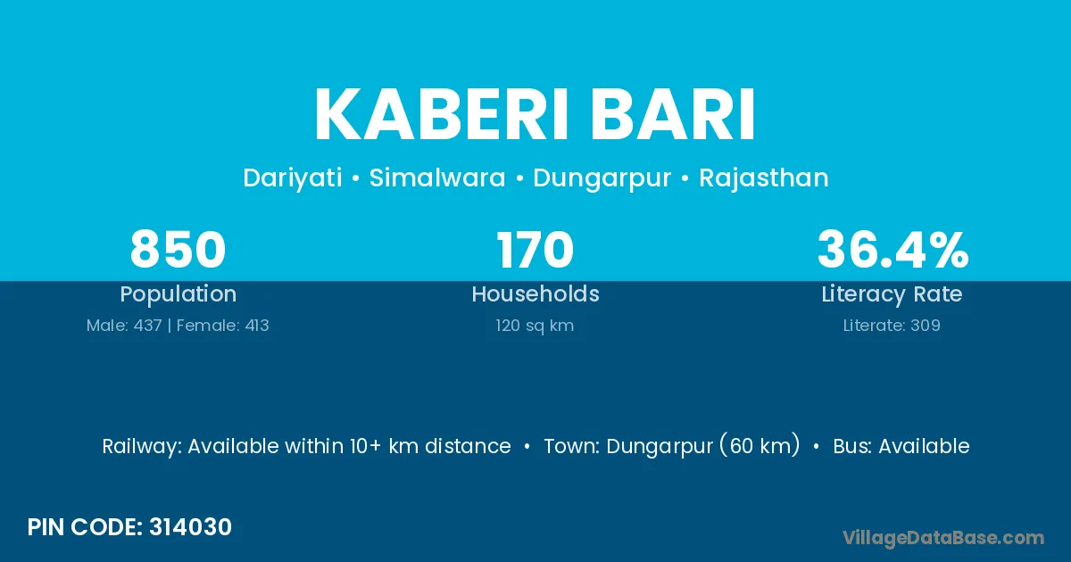 Dungarpur (60 km) is the nearest town to Kaberi Bari village for major economic activities and is located approximately 60 km away.