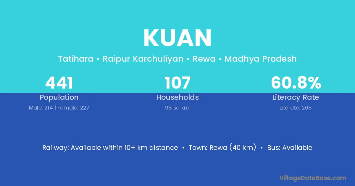 The literacy rate of Kuan village is 52.72%. Male literacy stands at 62.30% and female literacy at 42.16%.