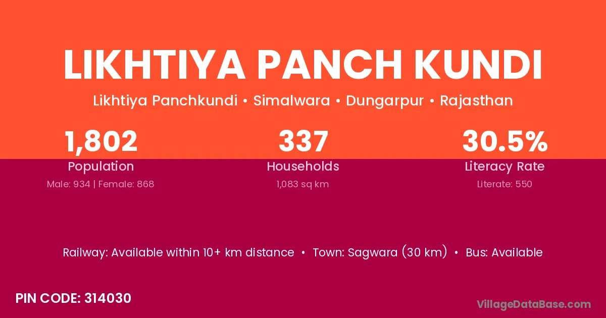 Sagwara (30 km) is the nearest town to Likhtiya Panch Kundi village for major economic activities and is located approximately 30 km away.