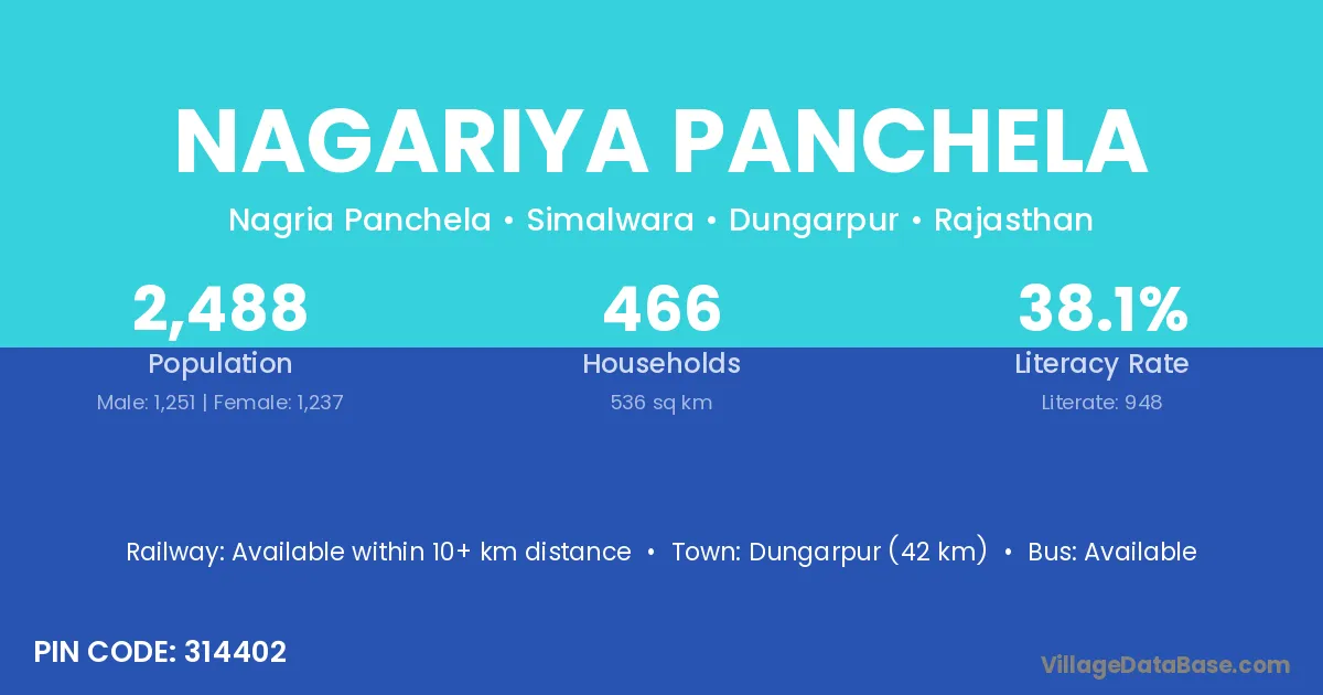 Dungarpur (42 km) is the nearest town to Nagariya Panchela village for major economic activities and is located approximately 42 km away.