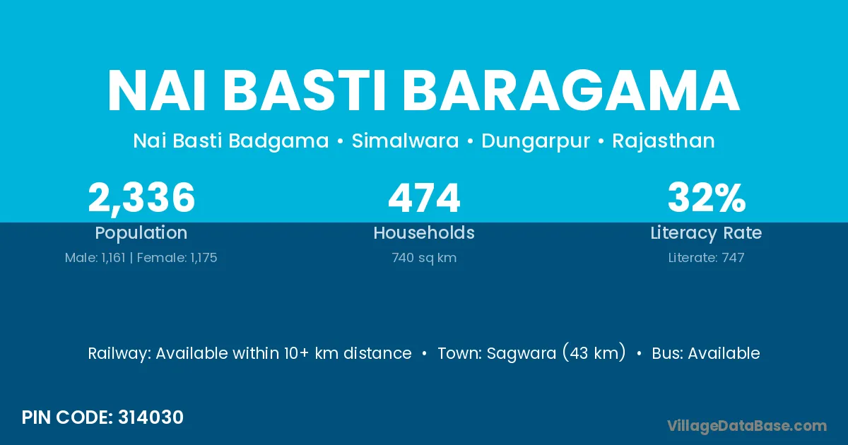 Sagwara (43 km) is the nearest town to Nai Basti Baragama village for major economic activities and is located approximately 43 km away.