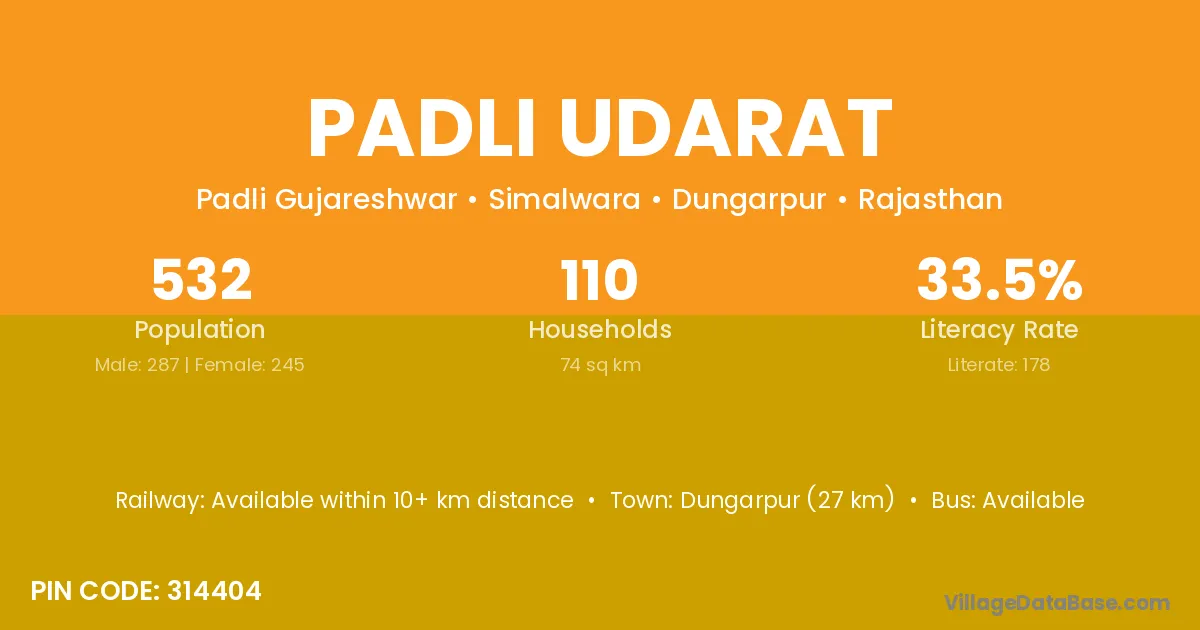 Dungarpur (27 km) is the nearest town to Padli Udarat village for major economic activities and is located approximately 27 km away.
