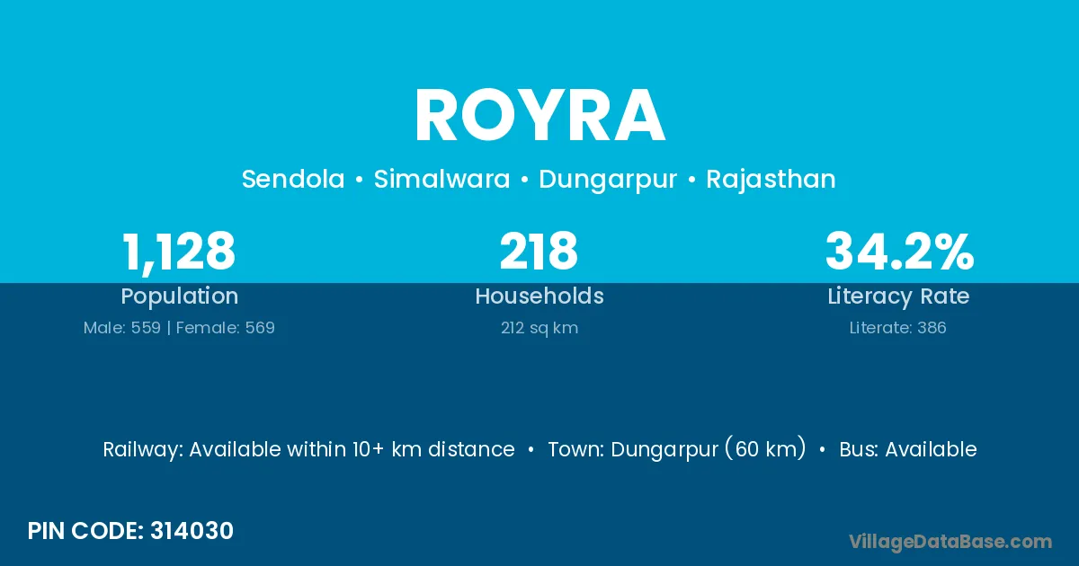 Dungarpur (60 km) is the nearest town to Royra village for major economic activities and is located approximately 60 km away.