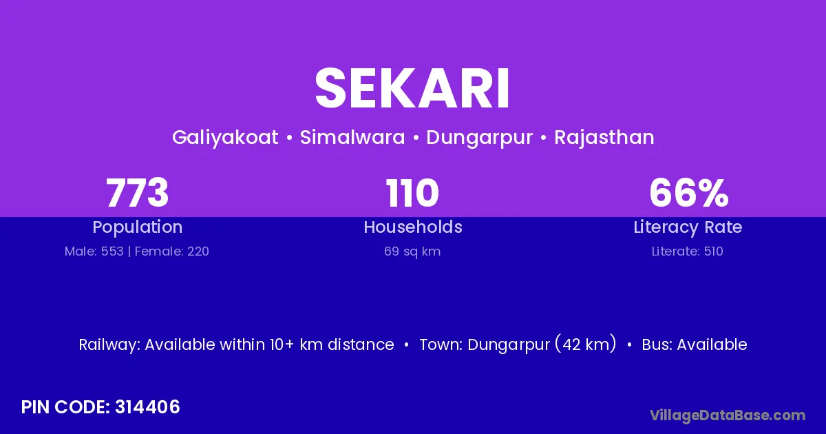 Dungarpur (42 km) is the nearest town to Sekari village for major economic activities and is located approximately 42 km away.