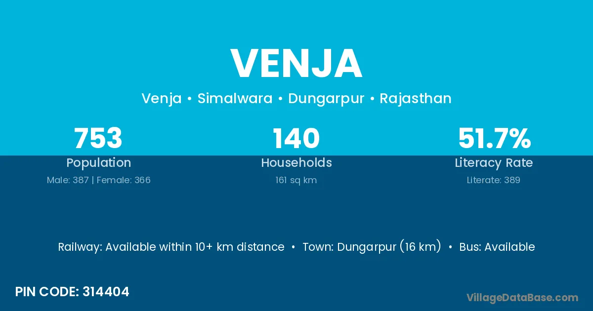 Dungarpur (16 km) is the nearest town to Venja village for major economic activities and is located approximately 16 km away.