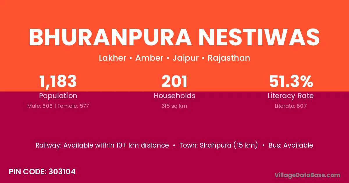 Shahpura (15 km) is the nearest town to Bhuranpura Nestiwas village for major economic activities and is located approximately 15 km away.