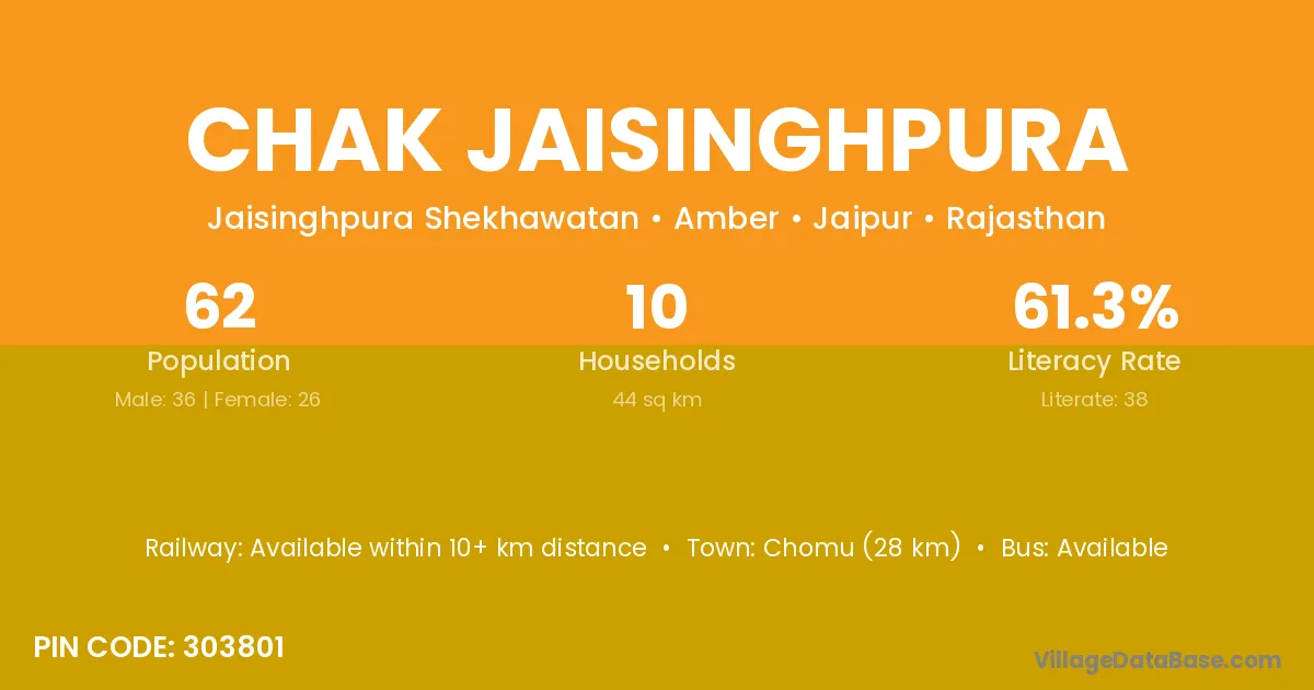 Chomu (28 km) is the nearest town to Chak Jaisinghpura village for major economic activities and is located approximately 28 km away.