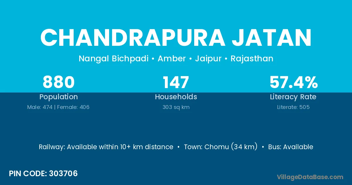 Chomu (34 km) is the nearest town to Chandrapura Jatan village for major economic activities and is located approximately 34 km away.