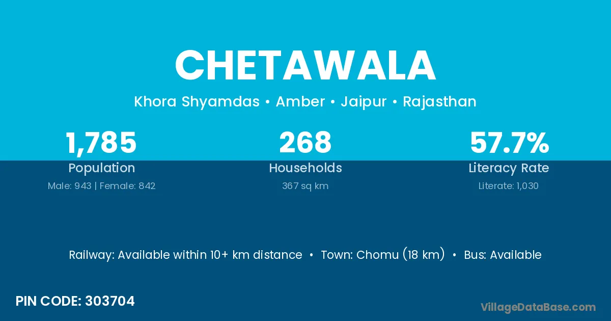 Chomu (18 km) is the nearest town to Chetawala village for major economic activities and is located approximately 18 km away.
