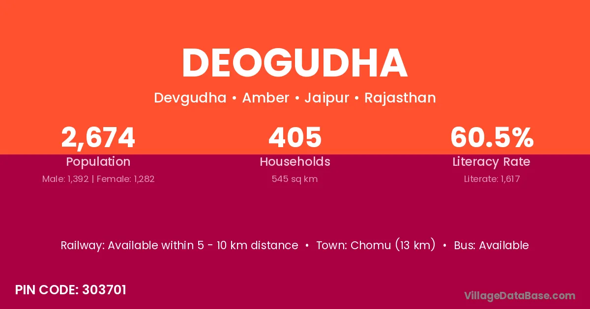 Chomu (13 km) is the nearest town to Deogudha village for major economic activities and is located approximately 13 km away.