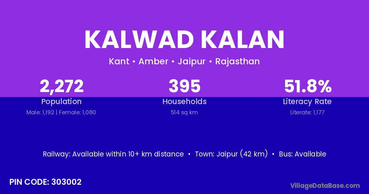 Jaipur (42 km) is the nearest town to Kalwad Kalan village for major economic activities and is located approximately 42 km away.