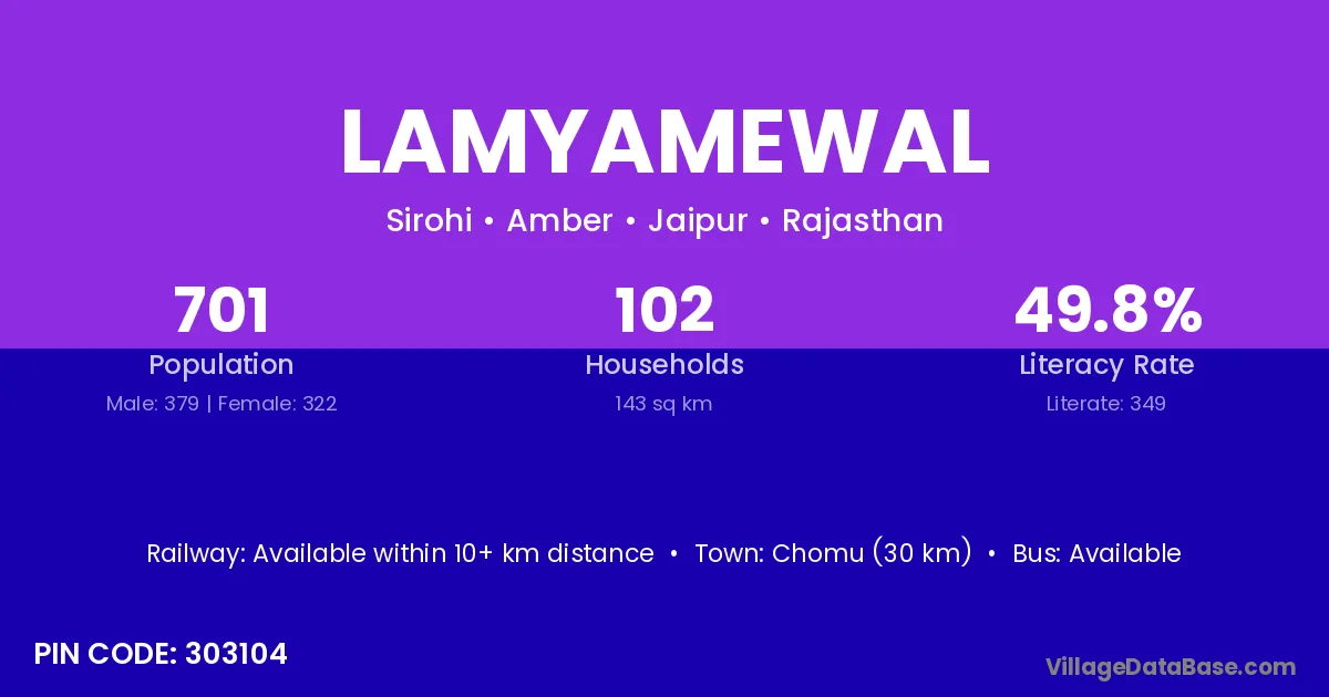 Chomu (30 km) is the nearest town to Lamyamewal village for major economic activities and is located approximately 30 km away.