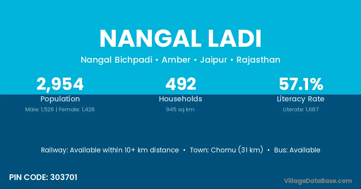 Chomu (31 km) is the nearest town to Nangal Ladi village for major economic activities and is located approximately 31 km away.