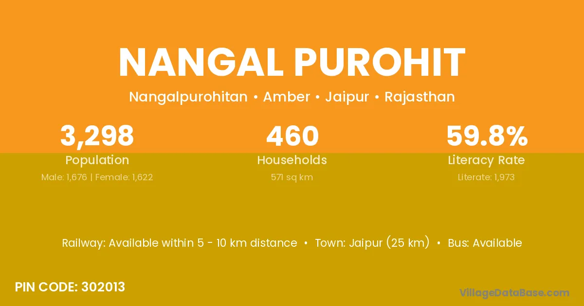 Jaipur (25 km) is the nearest town to Nangal Purohit village for major economic activities and is located approximately 25 km away.