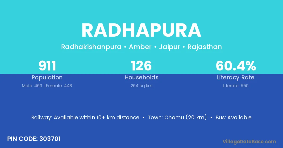 Chomu (20 km) is the nearest town to Radhapura village for major economic activities and is located approximately 20 km away.