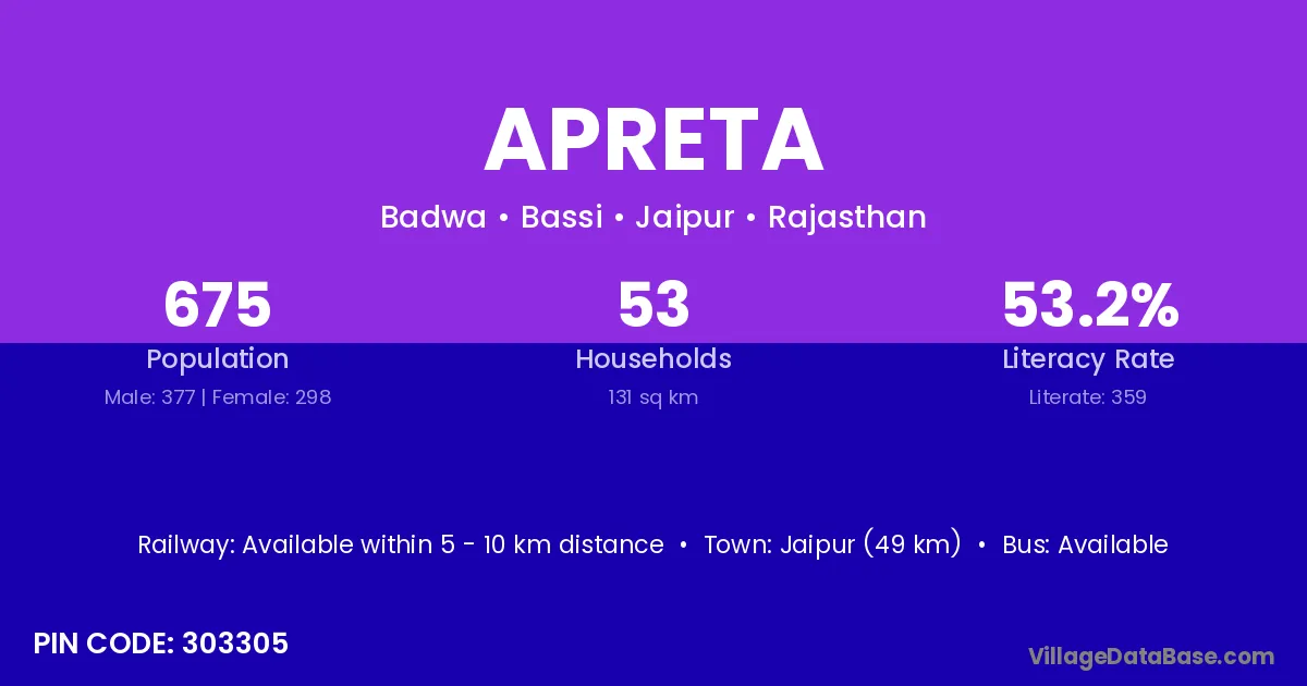 According to Census 2011 information, the village code of Apreta village is 303305.