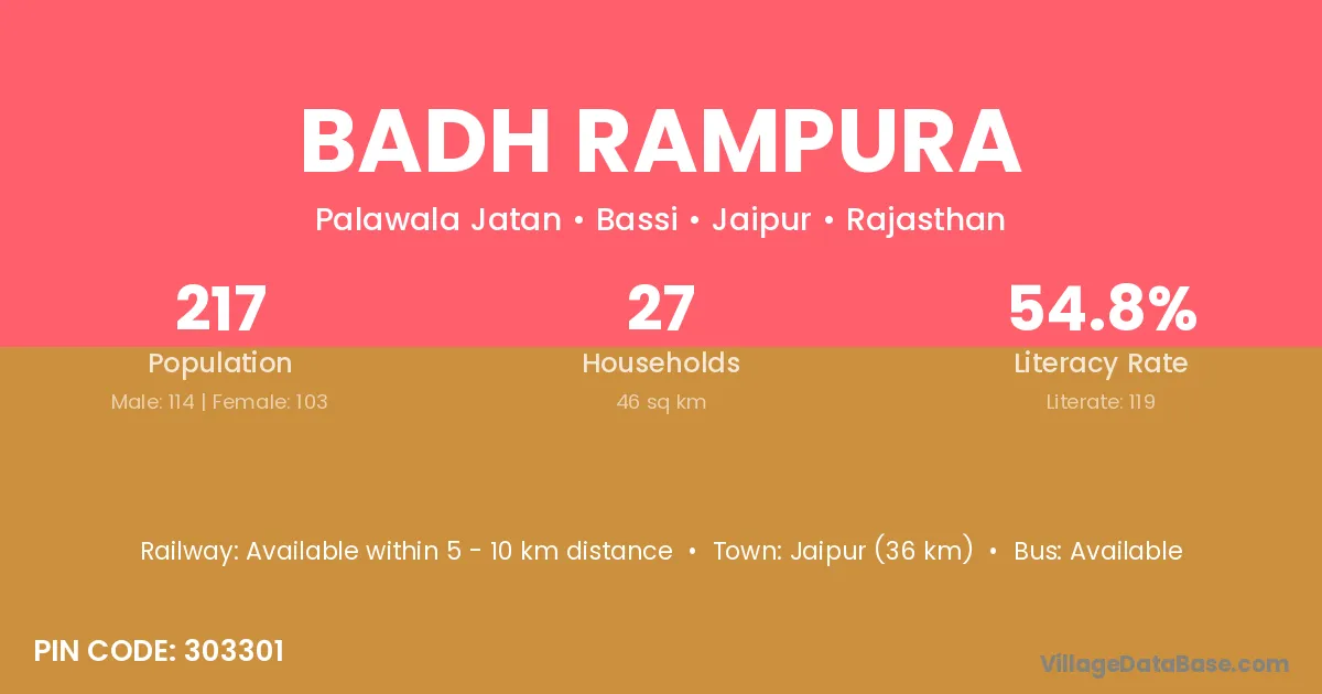 Badh Rampura village has a total population of 217 people, of which 114 are males and 103 are females.