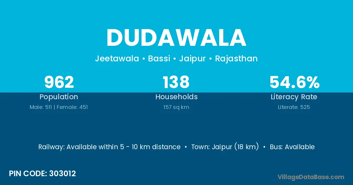 Jaipur (18 km) is the nearest town to Dudawala village for major economic activities and is located approximately 18 km away.