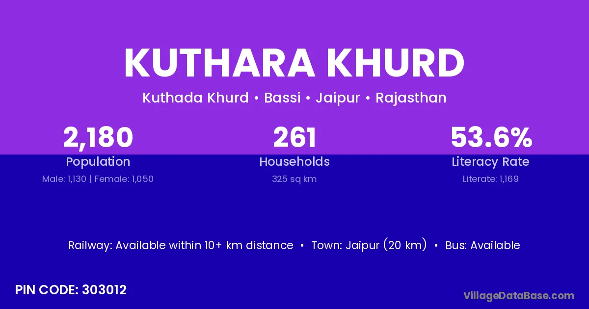 Kuthara Khurd village has a total population of 2,180 people, of which 1,130 are males and 1,050 are females.