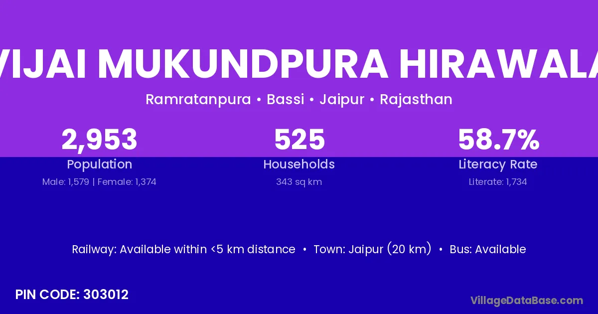Jaipur (20 km) is the nearest town to Vijai Mukundpura Hirawala village for major economic activities and is located approximately 20 km away.