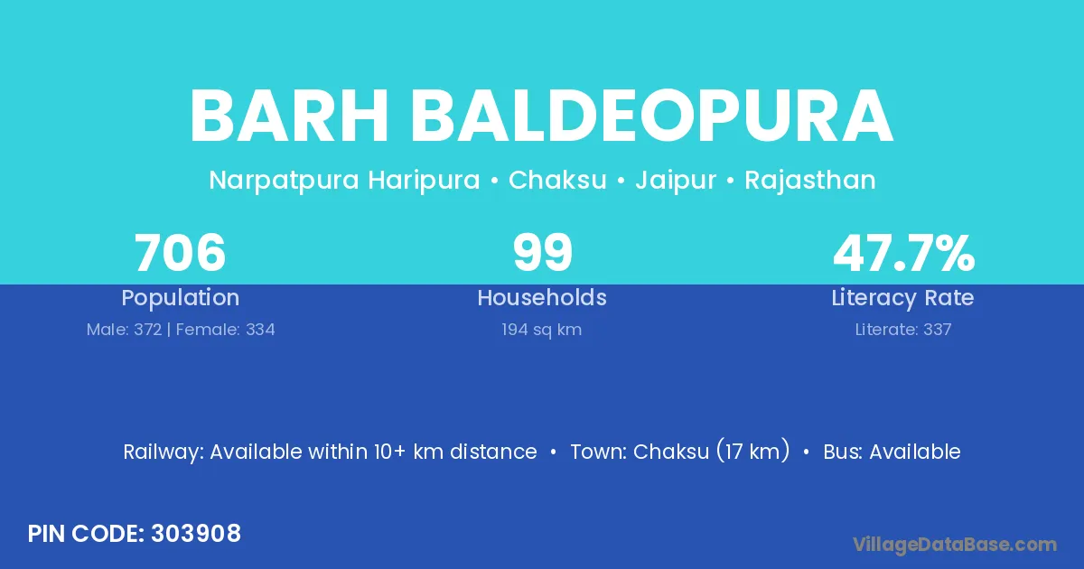 Chaksu (17 km) is the nearest town to Barh Baldeopura village for major economic activities and is located approximately 17 km away.