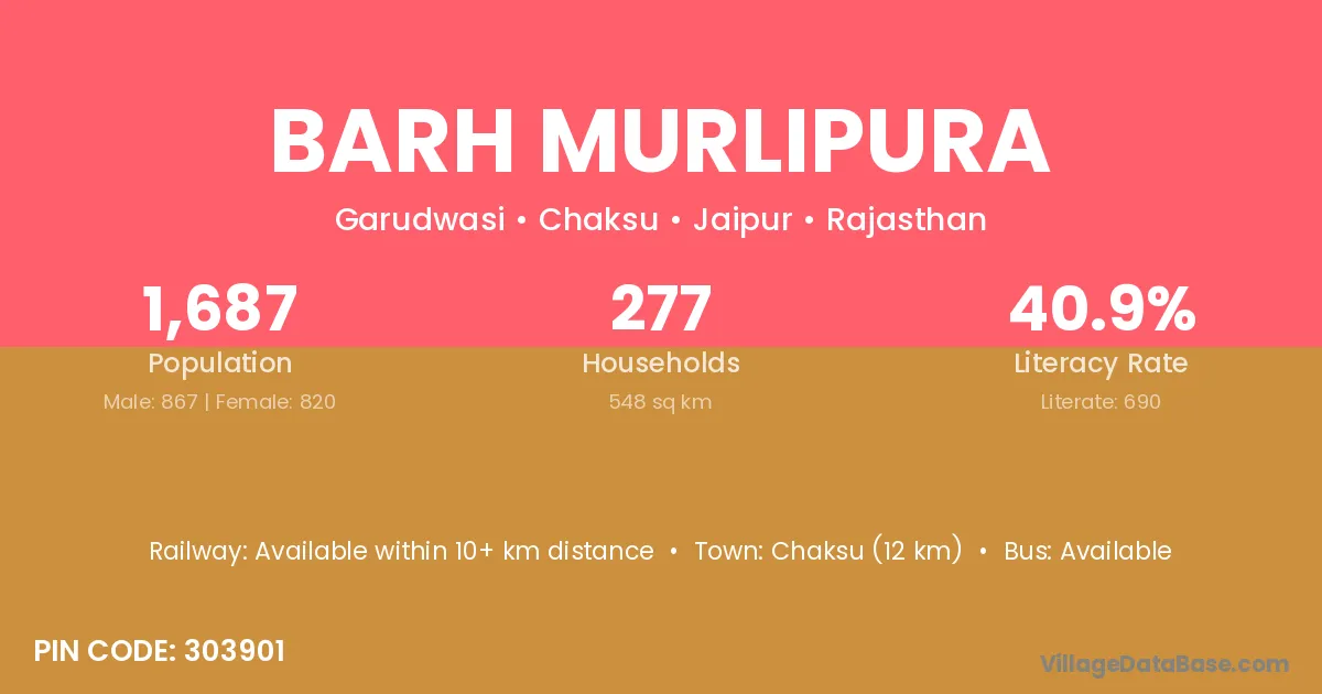 Chaksu (12 km) is the nearest town to Barh Murlipura village for major economic activities and is located approximately 12 km away.