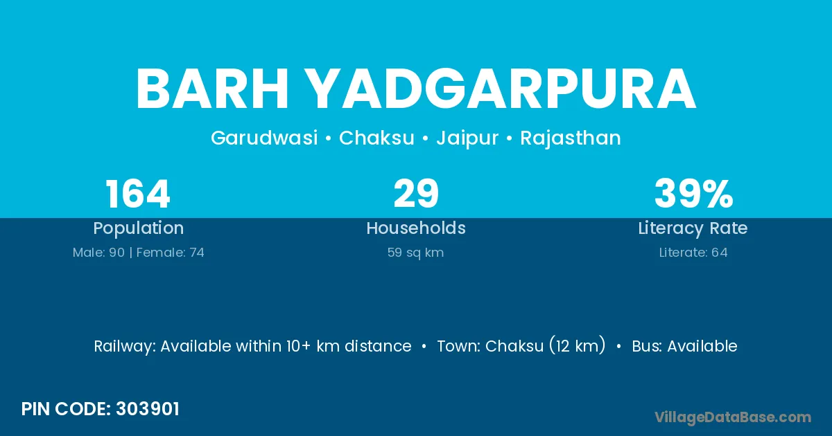 Chaksu (12 km) is the nearest town to Barh Yadgarpura village for major economic activities and is located approximately 12 km away.