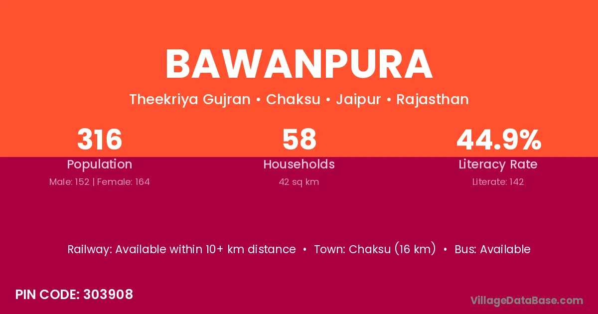 Chaksu (16 km) is the nearest town to Bawanpura village for major economic activities and is located approximately 16 km away.