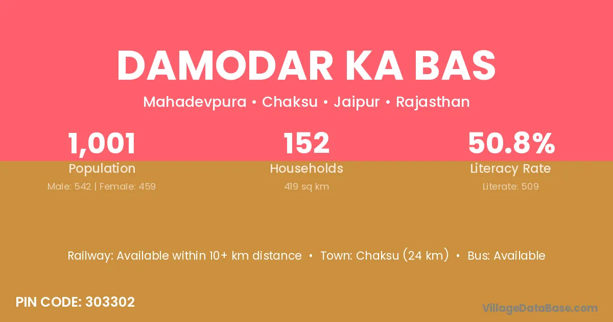 Chaksu (24 km) is the nearest town to Damodar Ka Bas village for major economic activities and is located approximately 24 km away.