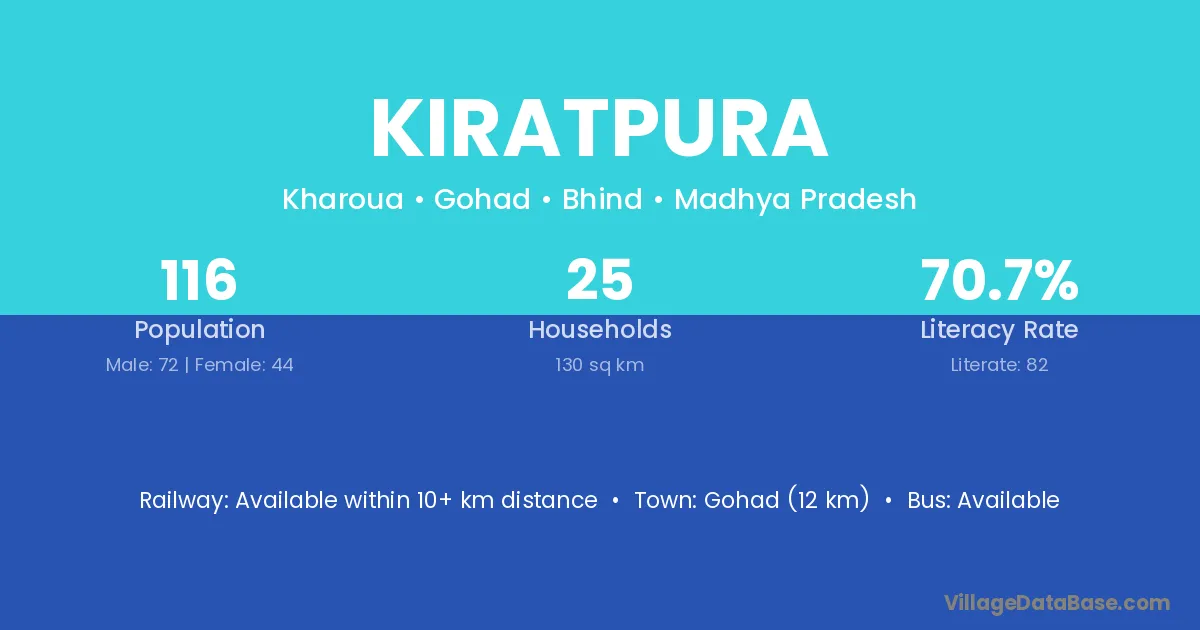 The literacy rate of Kiratpura village is 44.09%. Male literacy stands at 56.88% and female literacy at 28.88%.
