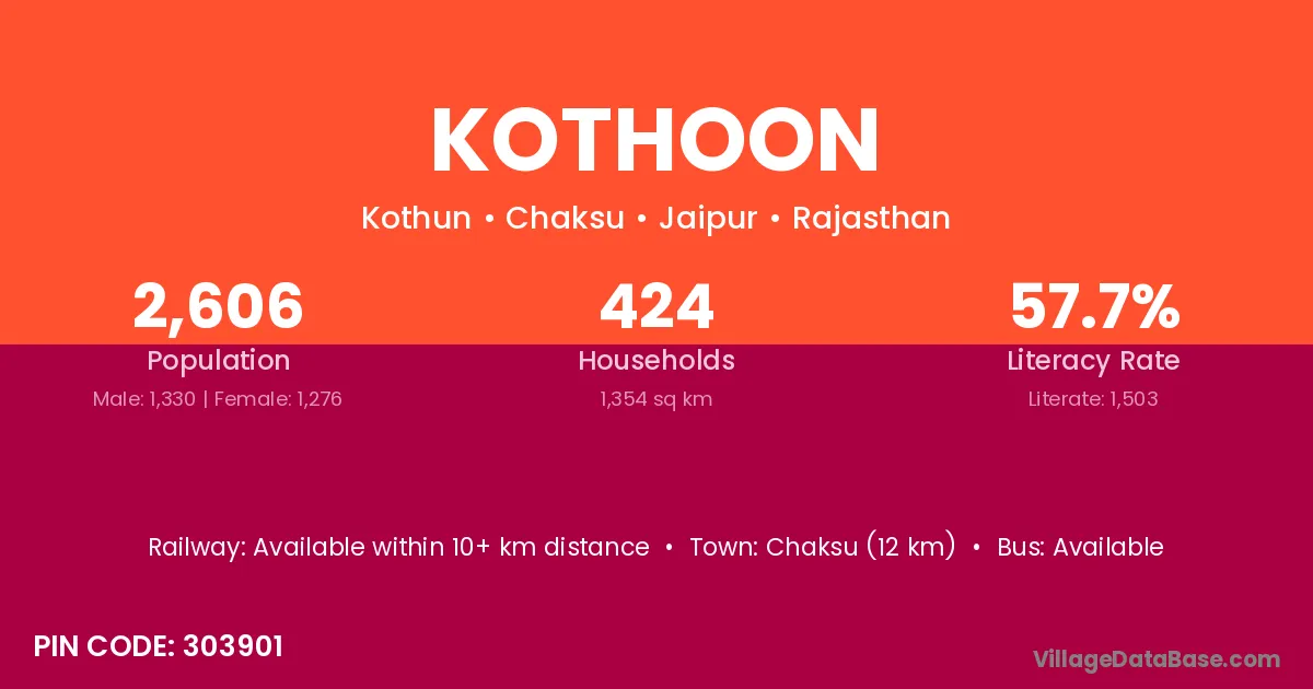 Chaksu (12 km) is the nearest town to Kothoon village for major economic activities and is located approximately 12 km away.