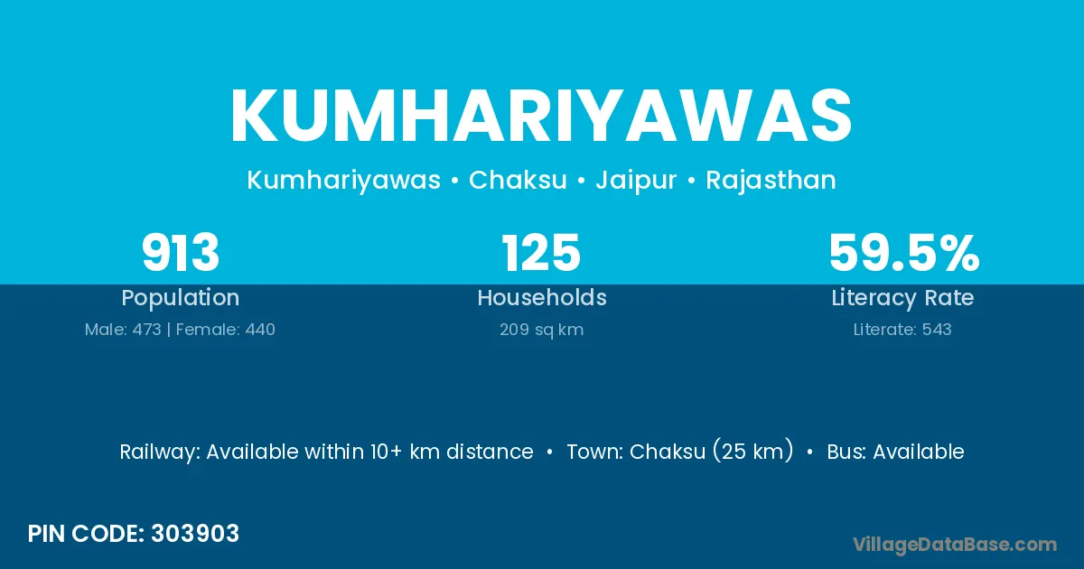 Chaksu (25 km) is the nearest town to Kumhariyawas village for major economic activities and is located approximately 25 km away.