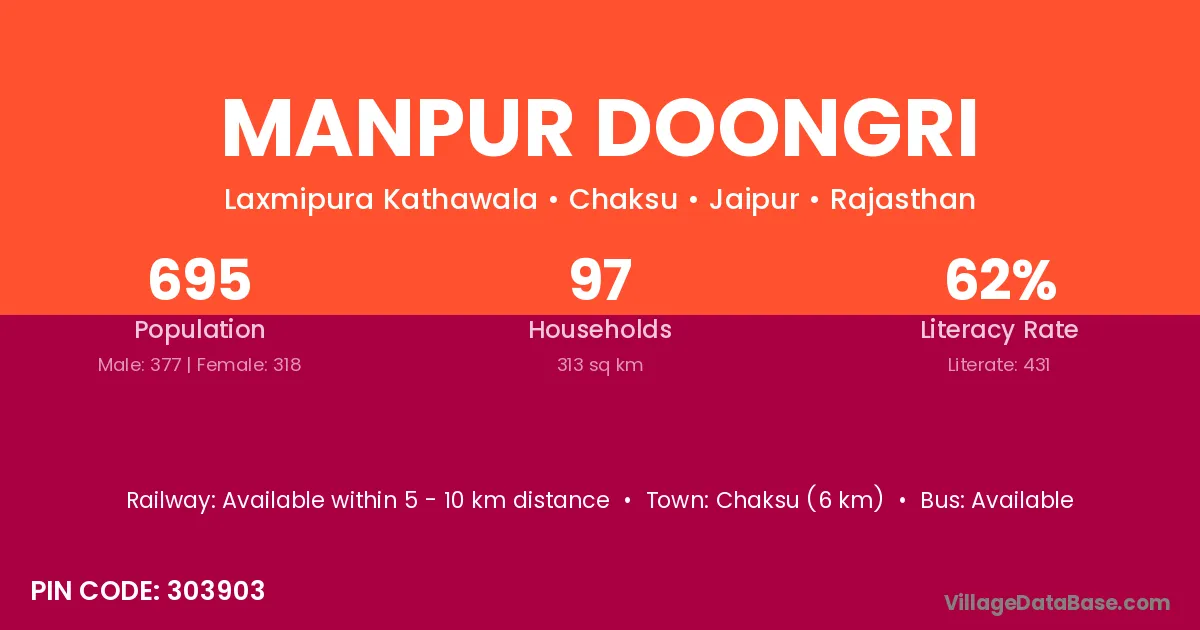 Chaksu (6 km) is the nearest town to Manpur Doongri village for major economic activities and is located approximately 6 km away.