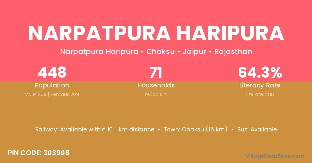 Chaksu (15 km) is the nearest town to Narpatpura Haripura village for major economic activities and is located approximately 15 km away.