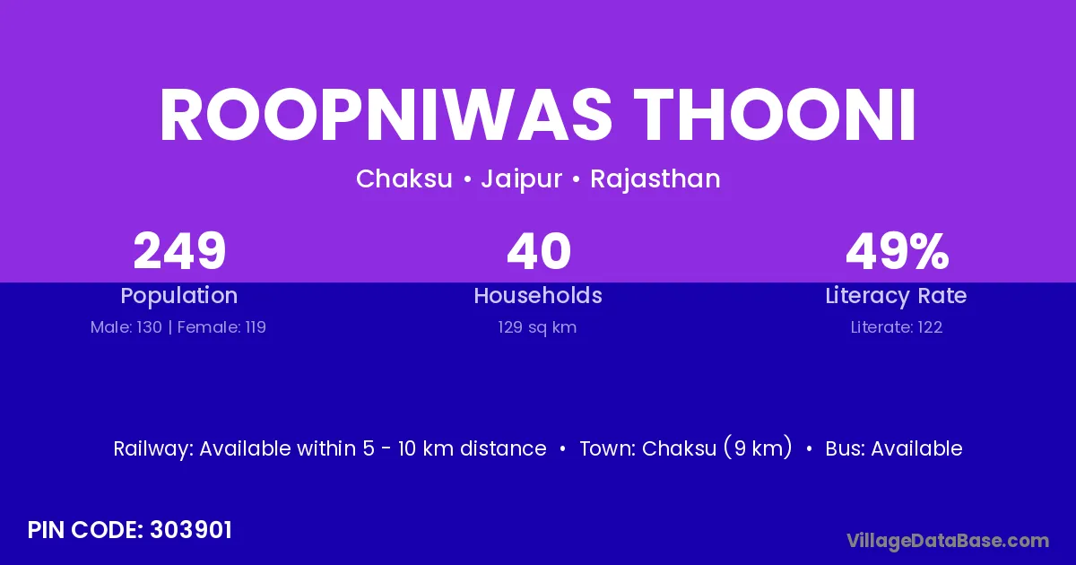 Chaksu (9 km) is the nearest town to Roopniwas Thooni village for major economic activities and is located approximately 9 km away.