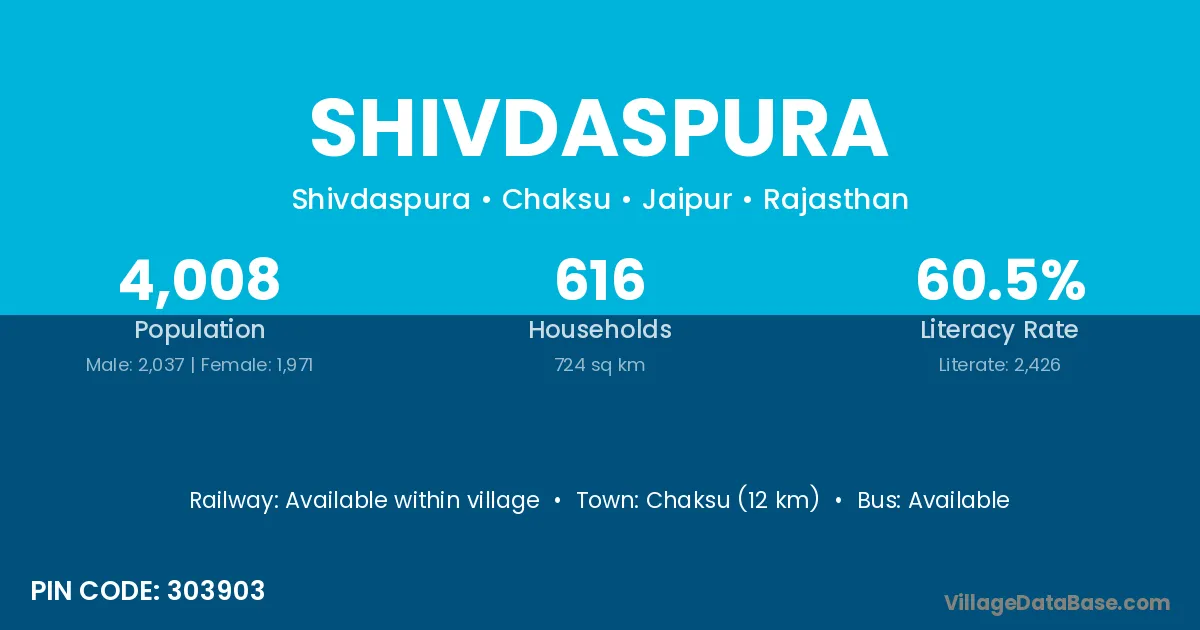 Chaksu (12 km) is the nearest town to Shivdaspura village for major economic activities and is located approximately 12 km away.