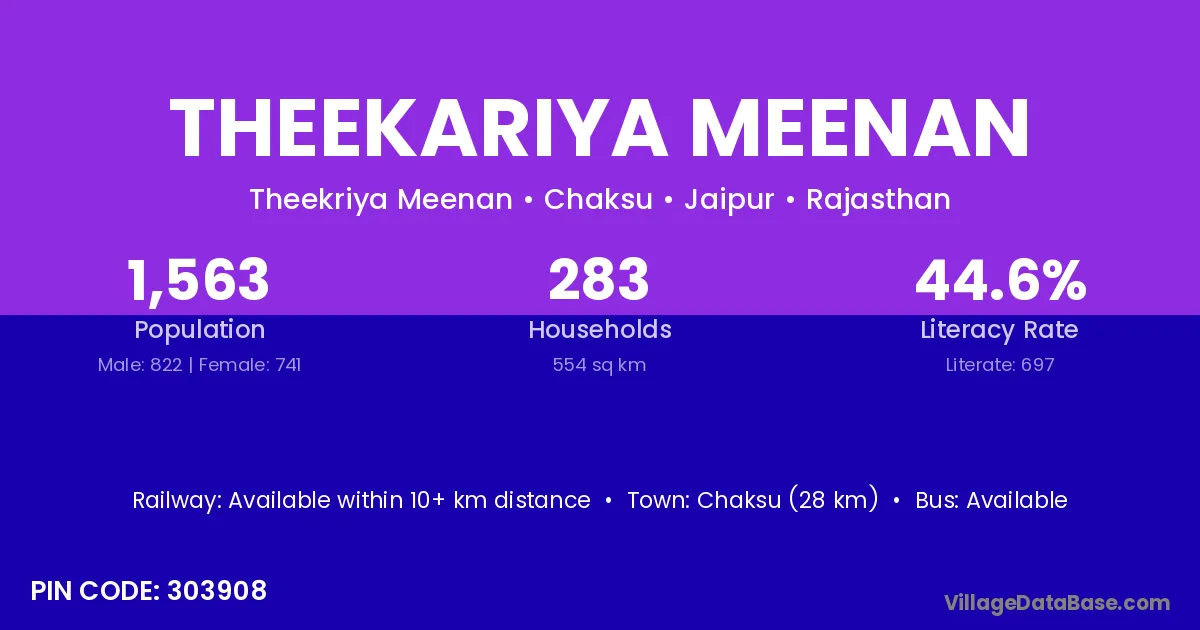 Chaksu (28 km) is the nearest town to Theekariya Meenan village for major economic activities and is located approximately 28 km away.