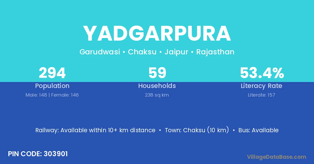 Chaksu (10 km) is the nearest town to Yadgarpura village for major economic activities and is located approximately 10 km away.