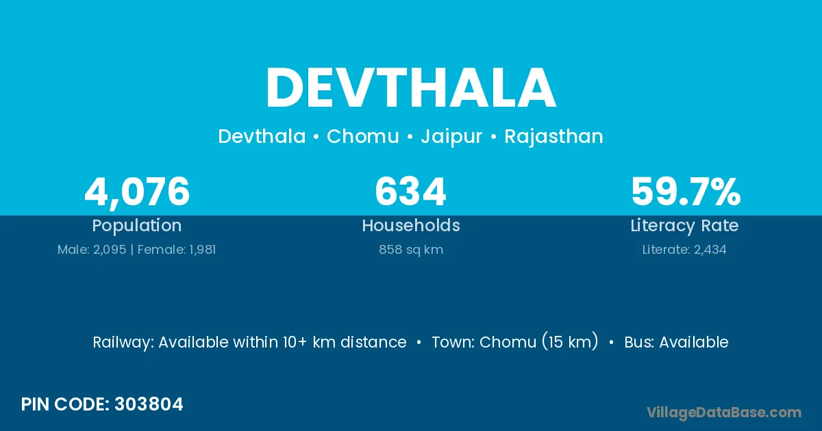 Chomu (15 km) is the nearest town to Devthala village for major economic activities and is located approximately 15 km away.
