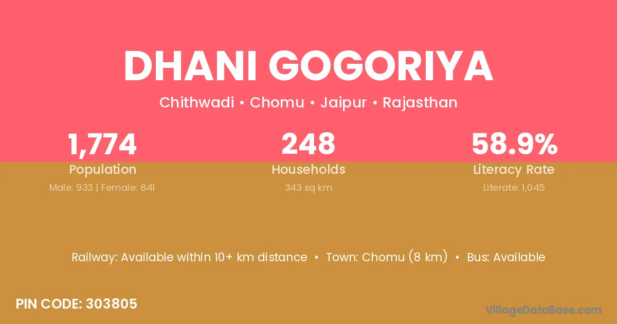 Chomu (8 km) is the nearest town to Dhani Gogoriya village for major economic activities and is located approximately 8 km away.