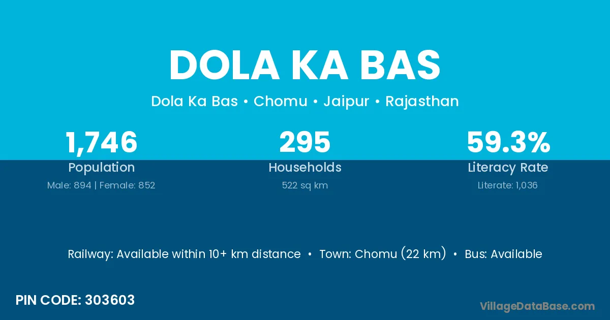 Chomu (22 km) is the nearest town to Dola Ka Bas village for major economic activities and is located approximately 22 km away.