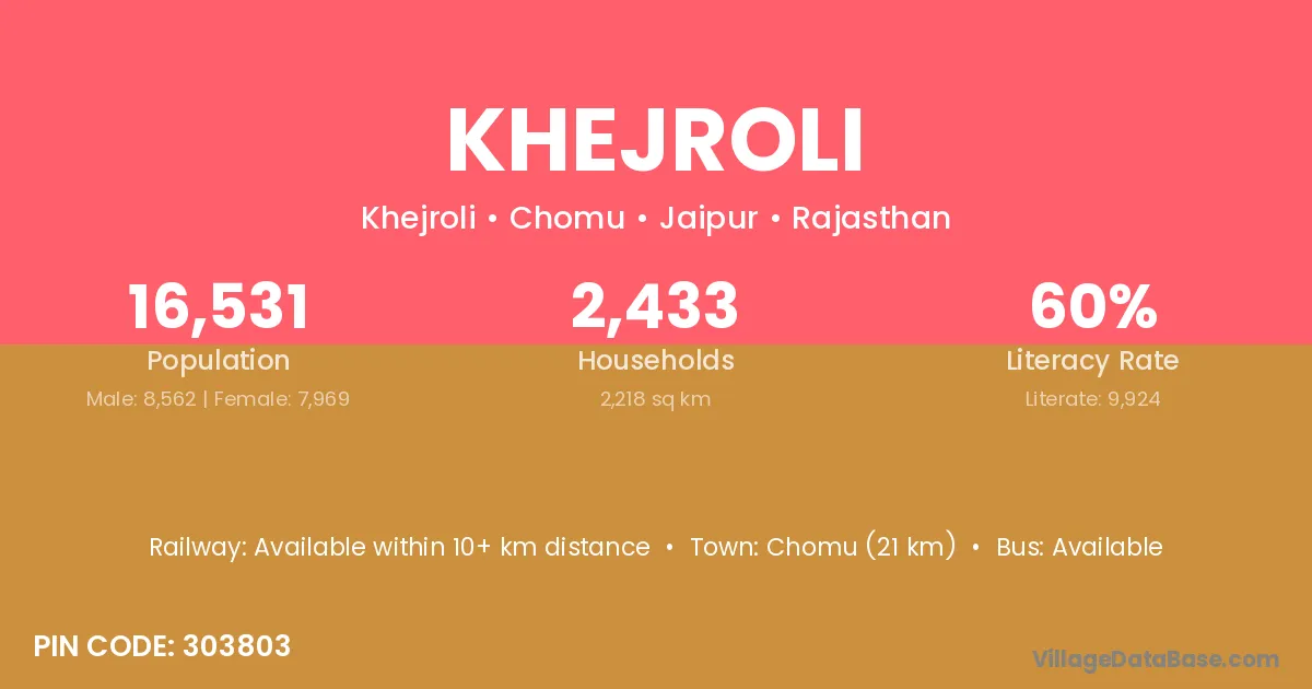 Chomu (21 km) is the nearest town to Khejroli village for major economic activities and is located approximately 21 km away.
