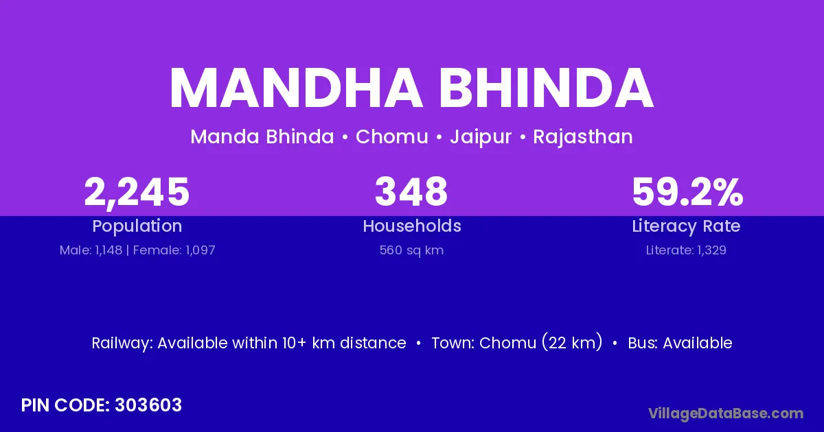 Chomu (22 km) is the nearest town to Mandha Bhinda village for major economic activities and is located approximately 22 km away.