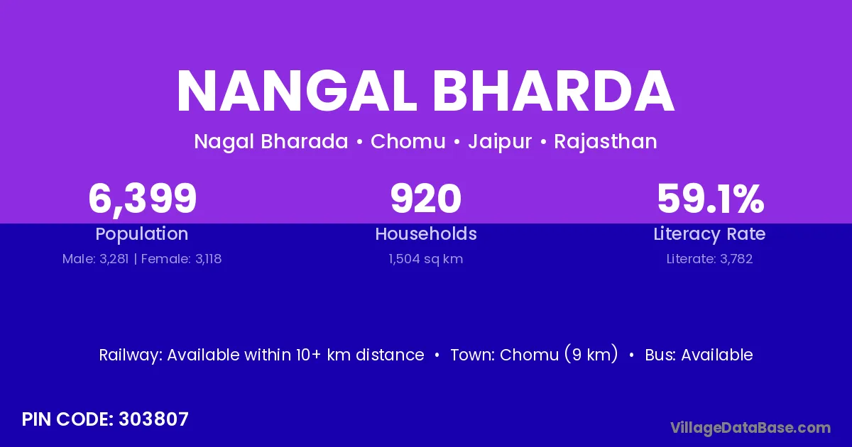 Chomu (9 km) is the nearest town to Nangal Bharda village for major economic activities and is located approximately 9 km away.