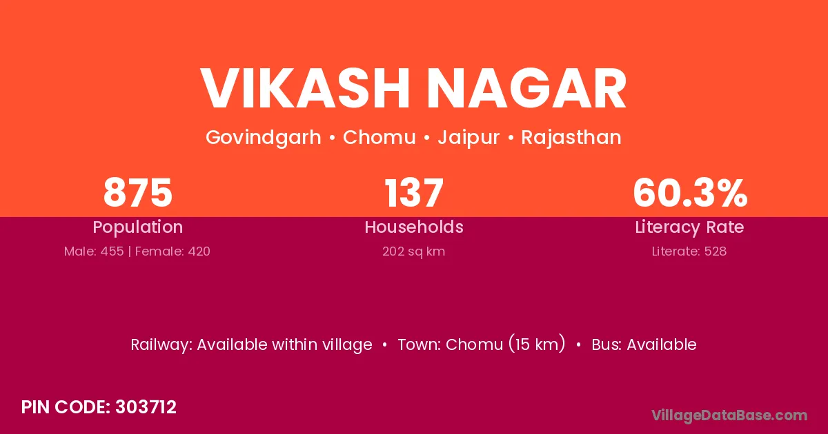 Chomu (15 km) is the nearest town to Vikash Nagar village for major economic activities and is located approximately 15 km away.
