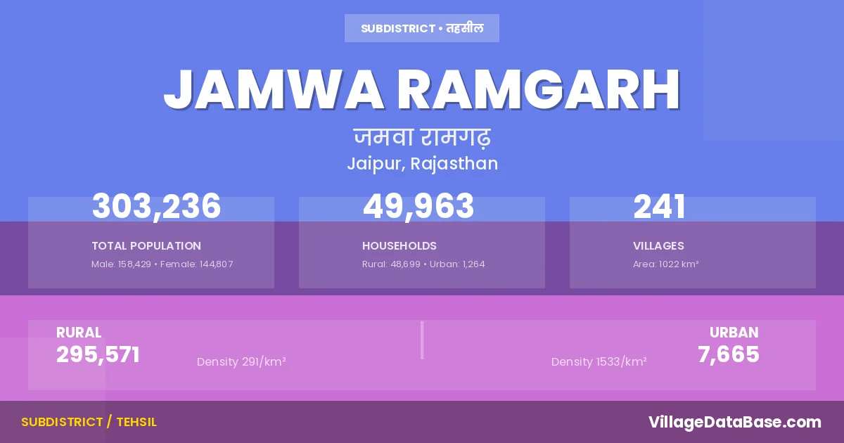 According to the 2011 census The total area of Jamwa Ramgarh Tehsil is 1022 km², with a population of 303236 people. The population density is 297 inhabitants per square kilometre, and there are approximately 49963 houses in the sub district.