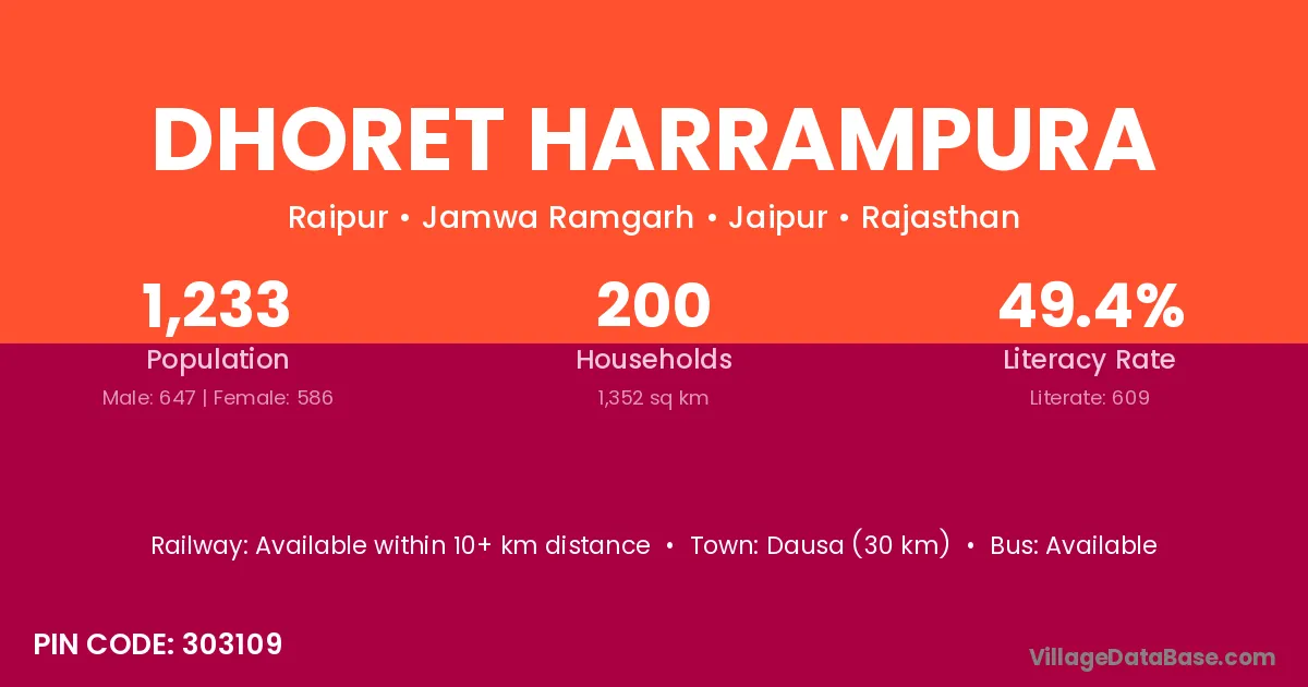 Dausa (30 km) is the nearest town to Dhoret Harrampura village for major economic activities and is located approximately 30 km away.